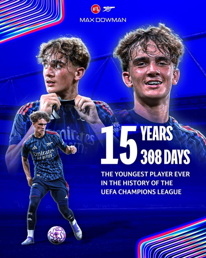 11月05日讯 本轮欧冠赛事 ,阿森纳小将15岁308天的道曼,成为欧冠有史以来最年轻登场球员!