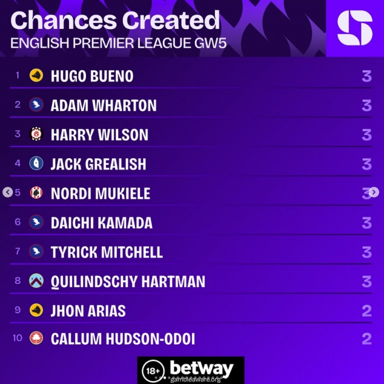 英超第5轮创造机会榜:乌戈-布埃诺等8名球员各创造3次机会