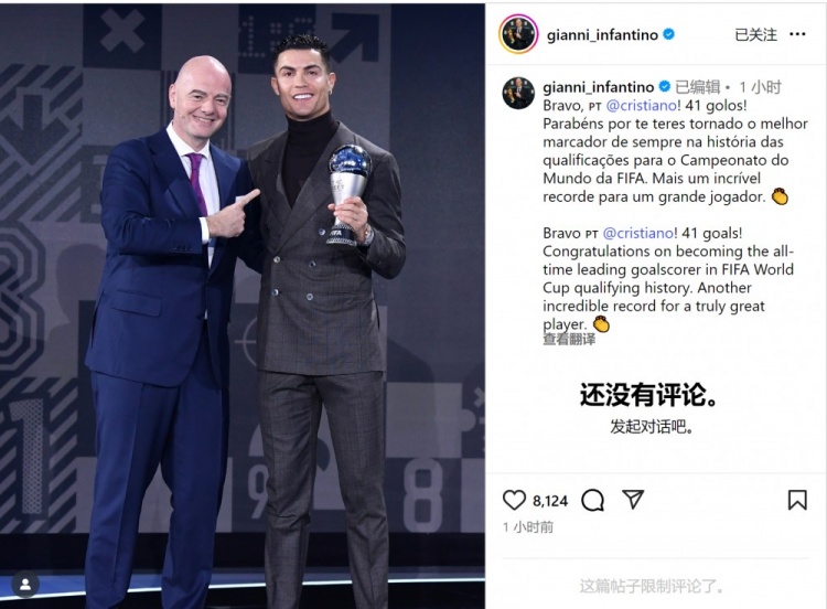 因凡蒂诺:祝贺C罗成为世预赛射手王,伟大球员再次斩获非凡记录