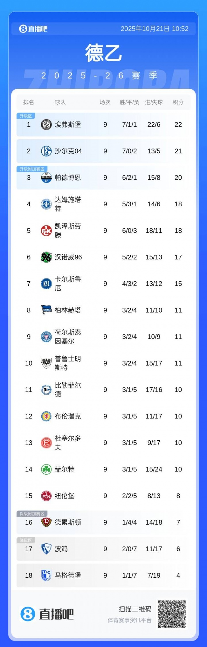 10月21日讯 德乙第9轮全部战罢后,沙尔克04暂时排名德乙第2,仅差榜首1分。