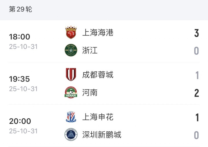 11月03日讯 中超第29轮,成都蓉城输球退赛争冠行列,上海海港、上海申花保留争冠悬念,两队需要等待22天方才揭晓第一名 归属。