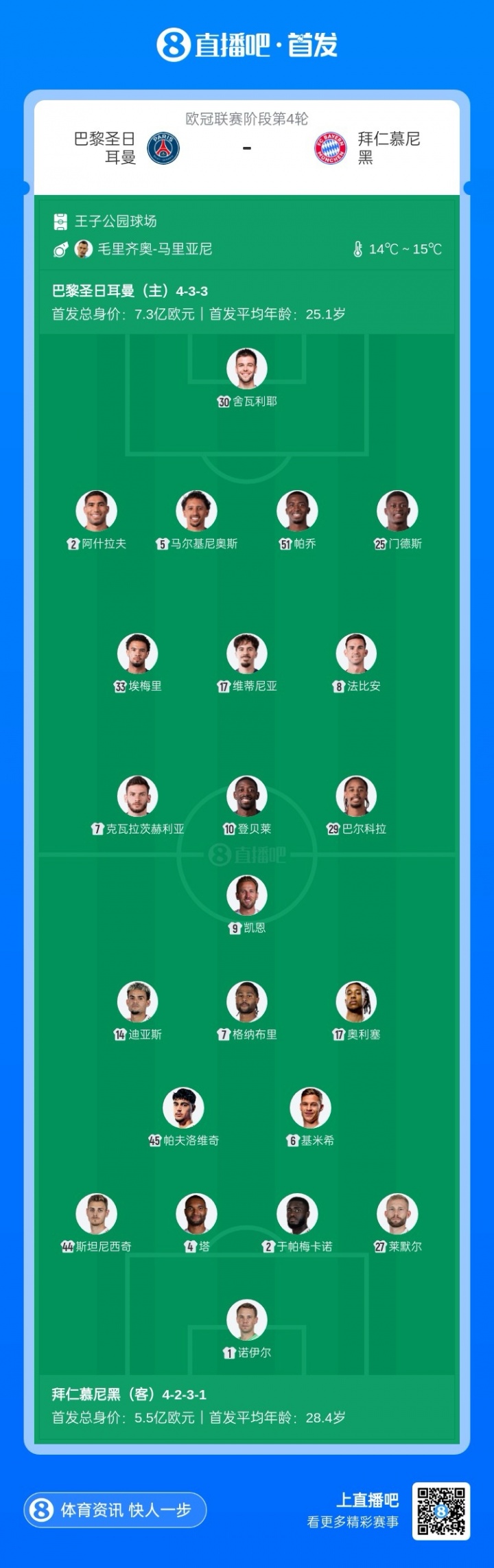 巴黎vs拜仁杆位:凯恩PK登贝莱,迪亚斯、奥利塞先发,门德斯出战