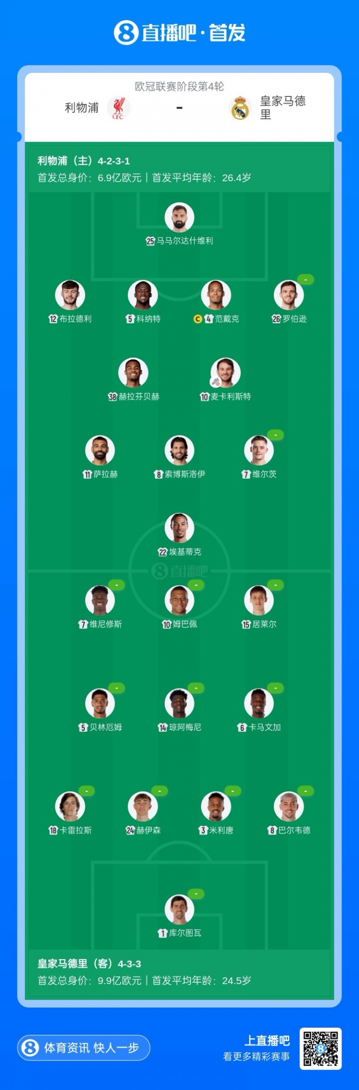 利物浦vs皇马杆位:阿诺德后备 !姆巴佩、萨拉赫、维尔茨先发