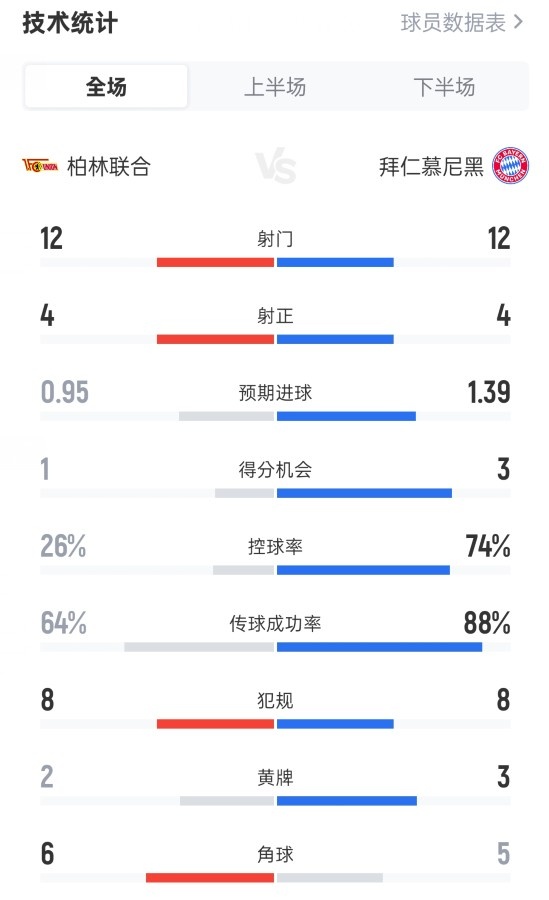 柏林联合2-2拜仁全场数据:射球 12-12,射正4-4,盘带时间 26%-74%