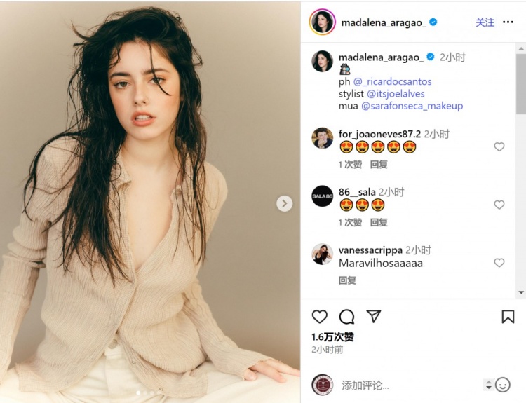 玛达莱娜社媒晒出写真,与网友分享美照。玛达莱娜现年20岁,英超直播是葡萄牙的新锐演员,她与若奥-内维斯在2024年确认恋爱关系。