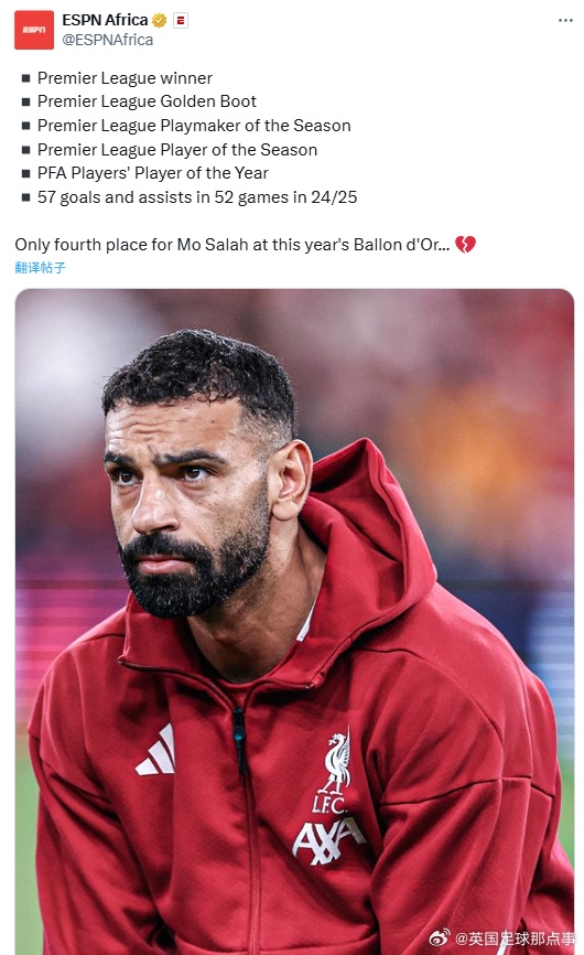ESPN声援萨拉赫:英超第一名 +金靴+助功 王 52场加入 57球 金球才第4