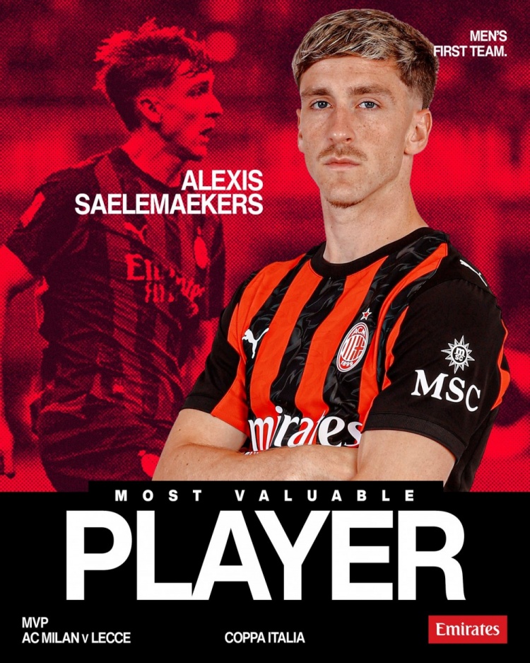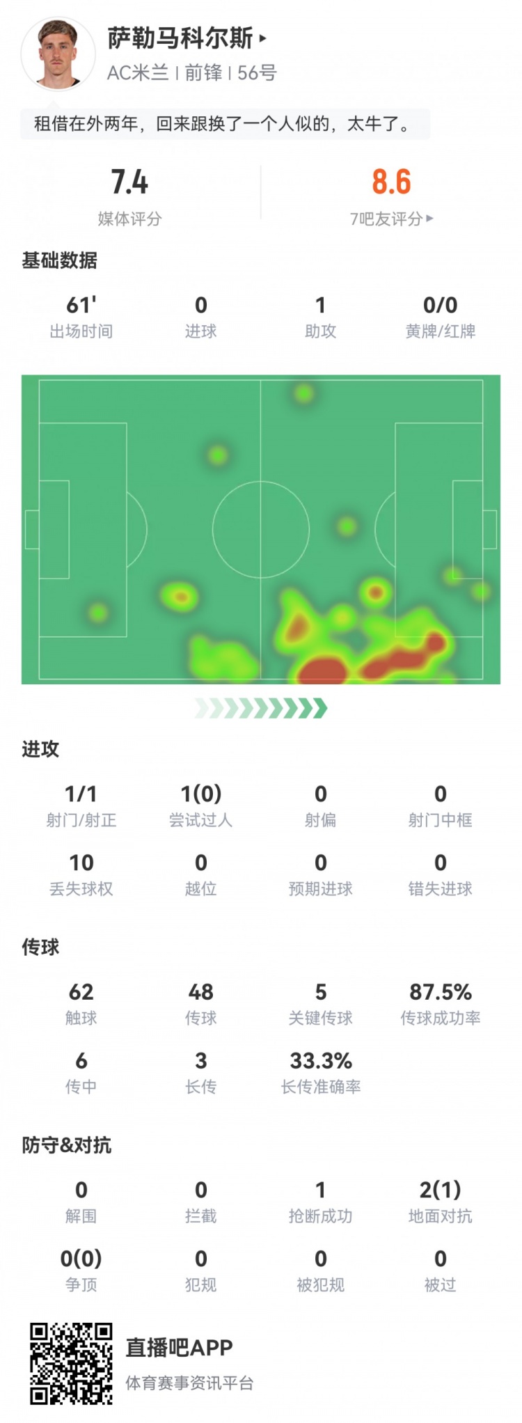 送出助功 !萨勒马科尔斯当选对阵莱切一役米兰队内最佳球员