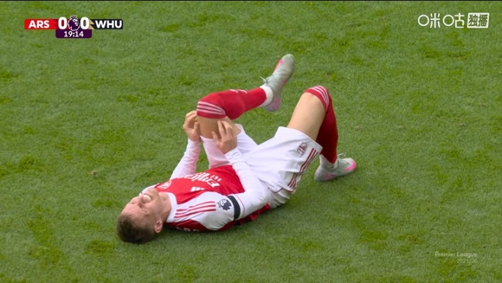 枪迷揪心!厄德高开场20分钟膝盖与对手追尾,两度躺在场地内