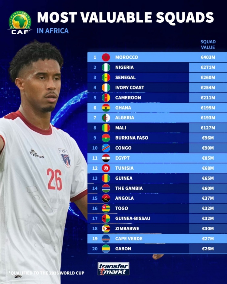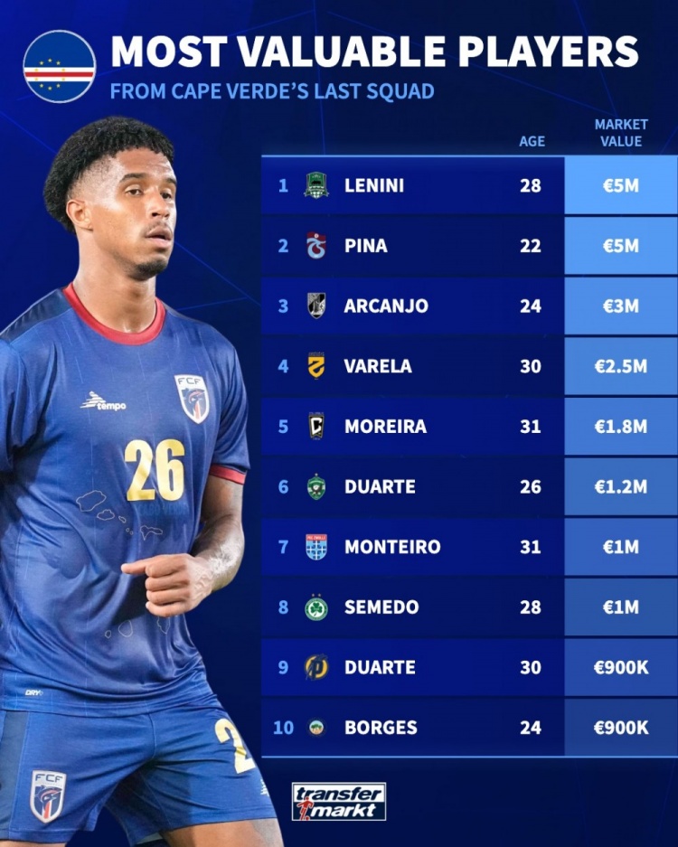 进军世界杯赛 !佛得角总身价2700万欧,排名非洲球队第19位!