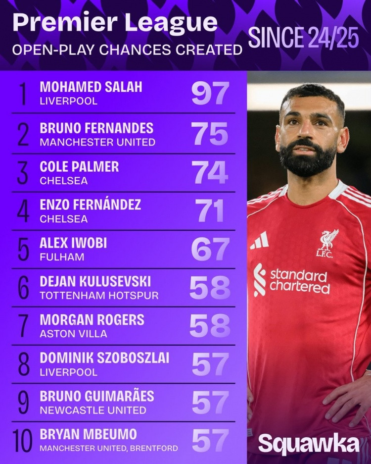 英超运动活动 战创造机会次数排行: 萨拉赫居首 B费、帕尔默分居二三位