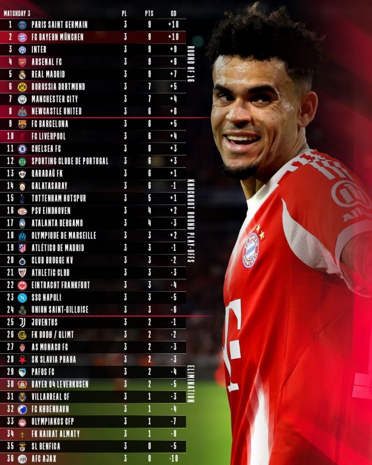 10月23日讯 在拜仁4-0击败布鲁日后,拜仁官方通过社交媒体晒出了欧冠积分榜。