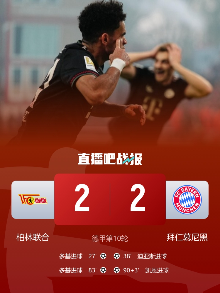16连胜记录 遭终结!拜仁2-2柏林联合 迪亚斯神仙球凯恩绝平