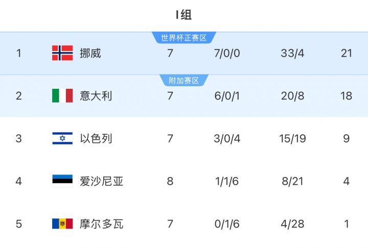 11月14日讯 世预赛欧洲区I组仅剩最后1轮,挪威领跑 意大利3分+17个净胜球,挪威基本锁定直通名额,意大利仅剩理论可能。末轮两队将直接交手,意大利至少赢挪威9个球才能直通世界杯赛 。